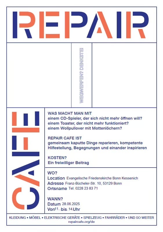 Einladung an alle Kessenicher zur Eröffnung des RepairCafes, Friesdenskirchengemeinde, Kessenich 28.06.2025